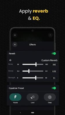 Enhance the richness and depth of your recordings with advanced settings like reverb and equalizer adjustments. Shape and mould your vocal performances with precision.